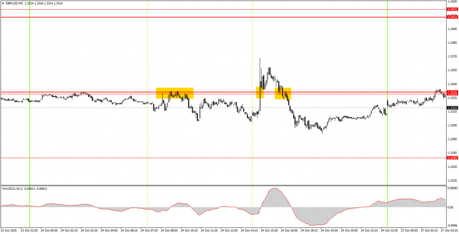 تداول زوج الجنيه الإسترليني/الدولار الأمريكي بشكل غير منطقي تمامًا يوم الجمعة. منذ الصباح الباكر، كان لدى السوق أسباب قوية لشراء العملة البريطانية، والتي كانت ستدعمها الصورة الفنية الحالية والخلفية الأساسية العالمية بشكل كامل. في المملكة المتحدة، تم نشر مؤشرات النشاط التجاري لقطاعي الخدمات والتصنيع لشهر أكتوبر، بالإضافة إلى بيانات مبيعات التجزئة. تجاوزت جميع التقارير الثلاثة توقعات المحللين، مما وفر أسبابًا قوية للشراء. ومع ذلك، لم نلاحظ أي رد فعل في السوق، حتى ولو كان طفيفًا، على التقارير الإيجابية نسبيًا من المملكة المتحدة.