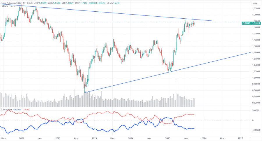 最新的交易者持倉報告(COT)日期為9月23日。如圖所示,非商業交易者的淨頭寸長期以來一直看漲。2024年年底,空頭短暫佔據了主導地位,但很快就失去了控制權。自特朗普開始其第二個美國總統任期以來,只有美元一直在不斷下跌。