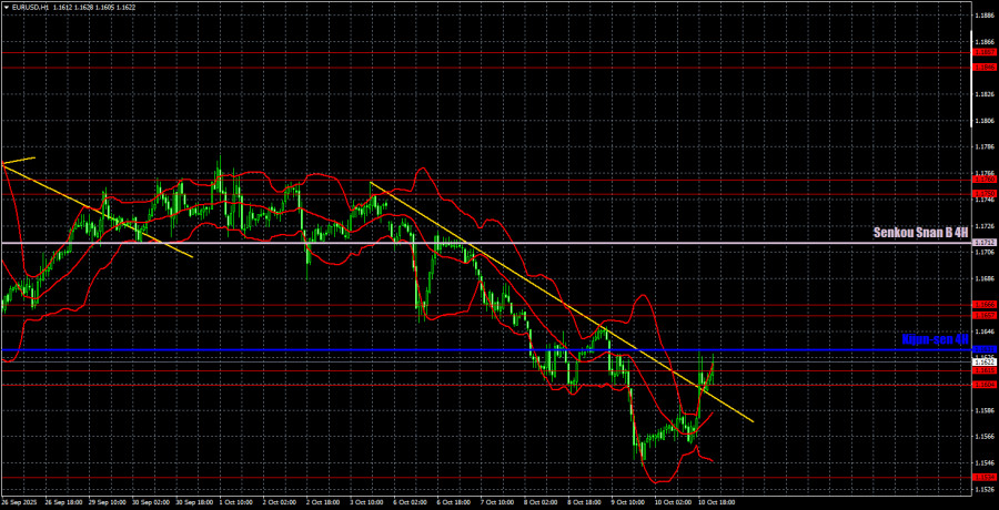 在 5 分鐘時間框架內,當天並未形成任何交易信號。更準確地說,整個交易時段都沒有出現信號。直到一天和一週的最後階段,該貨幣對才突破了 1.1604–1.1615 區域,但那時任何交易進場可能都已經太晚。同時也值得注意,在小時圖時間框架上,該貨幣對已經突破了下降趨勢線,這表明趨勢可能正在轉向上行。