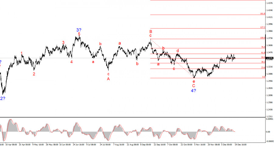 Allerdings sinkt auch die Inflation in Großbritannien und das in recht raschem Tempo. Damit hat die Bank of England ebenfalls die Möglichkeit, im nächsten Jahr die Politik weiter zu lockern. Die Frage ist: Welche der beiden Zentralbanken wird ihre Zinsen aggressiver senken? Meiner Ansicht nach wird die Nachfrage nach der US-Währung 2026 weiter abnehmen, aber vorerst beobachten wir noch abwechselnde korrigierende Wellensets. Es besteht die Möglichkeit, dass das neueste Aufwärtssegment impulsiv ist, jedoch besteht nicht viel Vertrauen darin. Welle 4 könnte sich durchaus noch weiter ausdehnen. Leider brachte die aktuelle Woche keine klare Antwort auf die Frage, wer derzeit in einer positiveren Stimmung ist - das Pfund oder der Dollar.