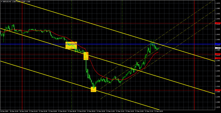 Pour le 18 décembre, nous mettons en avant les niveaux importants suivants : 1.2863, 1.2981-1.2987, 1.3042-1.3050, 1.3096-1.3115, 1.3201-1.3212, 1.3307, 1.3369-1.3377, 1.3437, 1.3533-1.3548, et 1.3584. Les lignes Senkou Span B (1.3308) et Kijun-sen (1.3383) peuvent également être des sources de signaux. Un niveau de Stop Loss est recommandé d’être placé au point mort si le prix se déplace de 20 pips dans la bonne direction. Les lignes de l'indicateur Ichimoku peuvent changer au cours de la journée, ce qui doit être pris en compte lors de la détermination des signaux de trading.