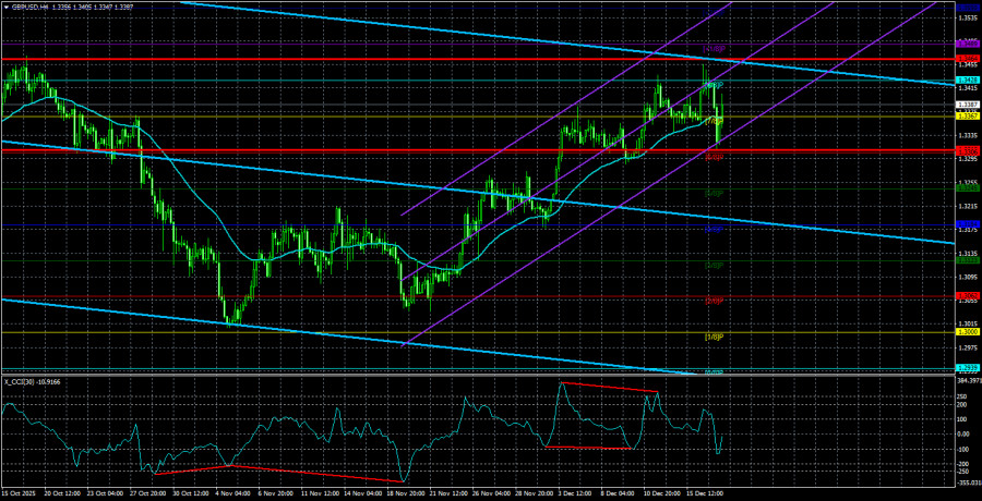 La volatilité moyenne de la paire GBP/USD au cours des cinq derniers jours de trading, en date du 18 décembre, est de 77 pips. Pour la paire livre/dollar, cette valeur est considérée comme "moyenne". Le jeudi 18 décembre, nous prévoyons que le pair évoluera dans une fourchette comprise entre 1.3308 et 1.3464. Le canal de régression linéaire supérieur pointe vers le bas, mais il s'agit simplement d'une correction technique sur des unités de temps supérieures. L'indicateur CCI est entré en territoire de survente 6 fois ces derniers mois et a formé plusieurs divergences "haussières", signalant régulièrement une probable reprise de la tendance haussière. La semaine dernière, l'indicateur a formé une nouvelle divergence haussière, mais la semaine s'est terminée par deux entrées en territoire de surachat et deux divergences "baissières". Conclusion : une correction dans la tendance haussière.