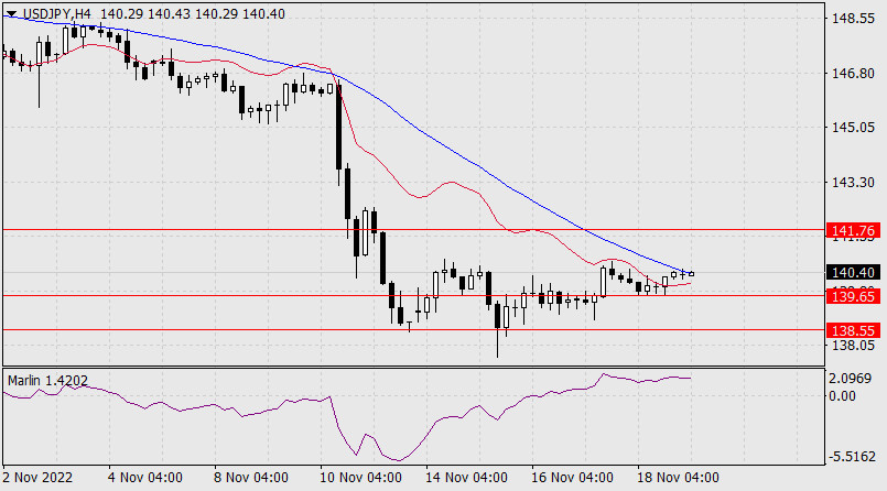 Harga sedang mencoba menembus garis MACD pada grafik empat-jam. Pembalikan ke bawah darinya merupakan dasar untuk pembalikan harga saat ini dari level saat ini. Jalan ke 141,76 akan terbuka ketika harga menetap di atas garis MACD. Garis sinyal Marlin Oscillator bergerak hampir secara horizontal, netral. Kami menunggu perkembangan.