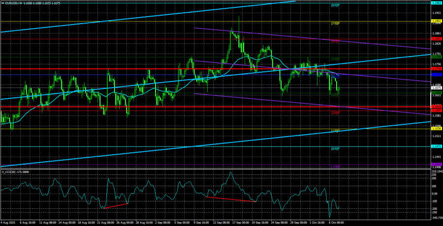 8 اکتوبر تک، گزشتہ پانچ تجارتی دنوں میں یورو/امریکی ڈالر میں اوسط اتار چڑھاؤ 65 پپس پر ہے، جسے "اعتدال پسند" سمجھا جاتا ہے۔ بدھ کو، ہم توقع کرتے ہیں کہ جوڑی 1.1610 اور 1.1740 کی سطحوں کے درمیان اتار چڑھاؤ آئے گی۔ اعلی لکیری ریگریشن چینل اوپر کی طرف اشارہ کرتا ہے، جو اس بات کی نشاندہی کرتا ہے کہ طویل مدتی اپ ٹرینڈ اب بھی برقرار ہے۔ CCI انڈیکیٹر زیادہ فروخت شدہ علاقے میں داخل ہو گیا ہے، جو اوپر کی حرکت کی اگلی لہر کو متحرک کر سکتا ہے۔