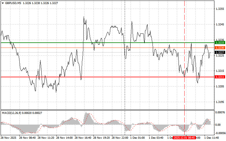 1.3211 پر قیمت کا امتحان اس وقت ہوا جب MACD اشارے پہلے ہی صفر لائن سے نمایاں طور پر نیچے کی طرف بڑھ چکا تھا، جوڑی کی نیچے کی صلاحیت کو محدود کرتا تھا۔ اس وجہ سے، میں نے پونڈ فروخت نہیں کیا.
