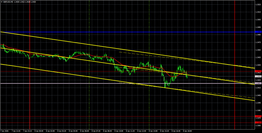 5 منٹ کے ٹائم فریم پر، آخری تجارتی سگنل بدھ کو قائم ہوا، جب قیمت نازک لائن سے گزر گئی۔ اس سگنل کی بنیاد پر شارٹ پوزیشنز کھولنے والے تاجر جمعرات کو تقریباً 40 پوائنٹس کا منافع کما سکتے تھے۔ 1.3421–1.3437 کی سطح سے واضح ریباؤنڈ ابھی تک نہیں ہوا ہے، اس لیے فی الحال یہ واضح نہیں ہے کہ جمعہ کو پاؤنڈ کس سمت تجارت کرے گا۔