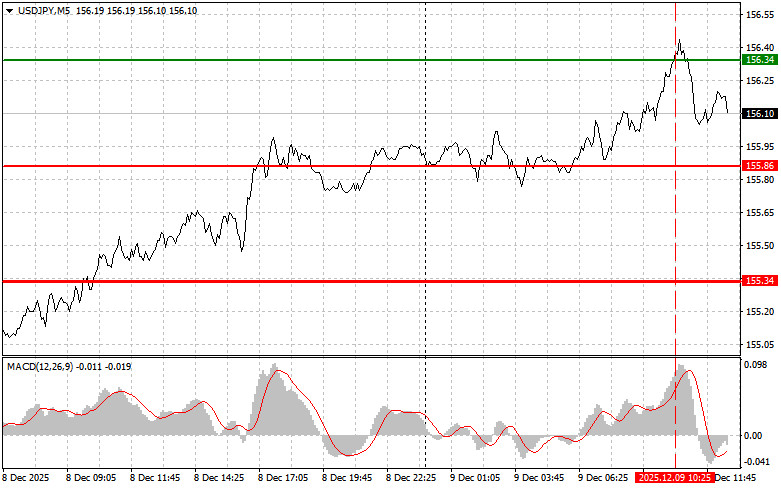Cenário 2: Também pretendo vender USD/JPY hoje caso haja dois testes consecutivos de 156,25 enquanto o MACD estiver na zona de sobrecompra. Isso limitará o potencial de alta do par e poderá provocar uma reversão para baixo. Uma queda em direção a 155,96 e 155,50 pode ser esperada.