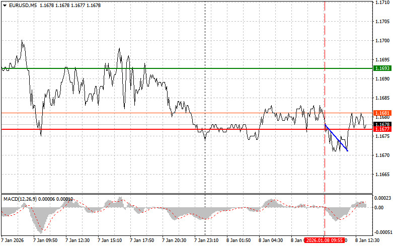 Cenário 1: Hoje, a compra do euro é possível se o preço atingir a região de 1,1687 (linha verde no gráfico), com alvo em 1,1715. Em 1,1715, pretendo sair do mercado e também vender o euro no sentido oposto, buscando um movimento de 30–35 pontos a partir do ponto de entrada. Uma alta forte do euro só pode ser esperada após a divulgação de dados fracos dos EUA.