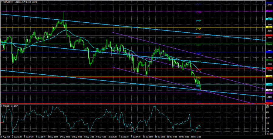 Валютная пара GBP/USD в течение вторника, среды и четверга продолжала нисходящее движение и отработала уровень Фибоначчи 38,2% на дневном ТФ. Напомним, что этот уровень – коррекционный по всему восходящему тренду 2025 года. Проще говоря, в данное время фунт стерлингов во второй раз скорректировался на 38,2% после роста на 1700 пунктов. Сейчас фунт стерлингов находится уже в довольно опасном для себя положении, потому что, если уровень 1,3141 будет уверенно преодолен, это будет означать, что коррекция продолжится. Мы продолжаем считать, что фундаментальных и макроэкономических оснований для роста доллара США нет, но их не было и в октябре(за редким исключением). Однако, как видим, американская валюта уверенно растет.