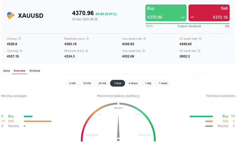 Сегодня пара XAU/USD показывает осторожный рост в азиатскую сессию, пытаясь отыграть понедельничное падение и тестируя уровень 4381.00 (максимумы октября) на пробой. При этом активность остаётся низкой: большинство инвесторов готовятся к новогодним торгам и не спешат открывать новые позиции.