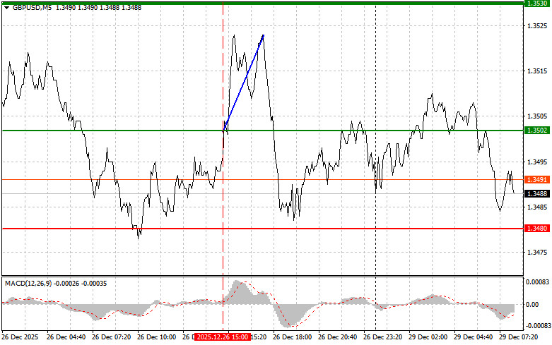 Tình huống Số 1: Tôi dự định mua đồng bảng Anh hôm nay khi đến điểm nhập quanh mức 1.3500 (đường xanh trên biểu đồ), với mục tiêu là di chuyển tới 1.3530 (đường xanh đậm hơn trên biểu đồ). Gần 1.3530, tôi dự định thoát khỏi các vị thế mua dài và bán trở lại, dự kiến một chuyển động 30-35 pips ngược hướng từ điểm nhập. Không có khả năng sẽ có một sự tăng mạnh của đồng bảng ngày hôm nay. Quan trọng! Trước khi mua, hãy đảm bảo rằng chỉ báo MACD đứng trên ngưỡng số không và đang bắt đầu tăng từ đây.