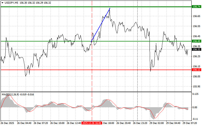 Kịch bản số 1: Tôi dự định mua USD/JPY ngày hôm nay khi đạt đến điểm nhập khoảng 156.40 (đường màu xanh lá trên biểu đồ), nhắm đến việc di chuyển lên 156.74 (đường xanh lá đậm hơn trên biểu đồ). Gần 156.74, tôi dự định sẽ thoát khỏi các vị thế dài và bán lại, kỳ vọng có sự di chuyển ngược hướng khoảng 30-35 pips từ điểm nhập. Tốt nhất là nên quay lại mua cặp này trong các phiên điều chỉnh và các đợt giảm đáng kể của USD/JPY. Quan trọng! Trước khi mua khi giá phá vỡ, hãy đảm bảo rằng chỉ số MACD đang ở trên mốc không và vừa mới bắt đầu tăng từ đó.