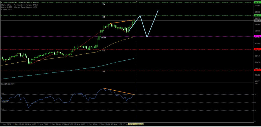 منطقة رد الفعل الإيجابي: إذا تعزز سعر الفضة واخترق مستوى 54.282، فقد تتاح له الفرصة لاختبار 55.343.