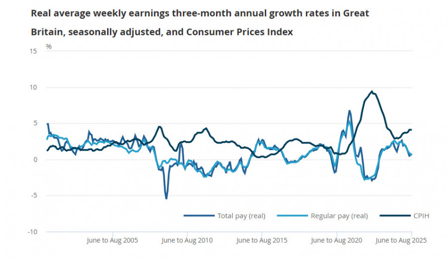 أظهر تقرير سوق العمل في المملكة المتحدة لشهر أغسطس عدم وجود أي مؤشر على أن الضغوط التضخمية من المحتمل أن تتراجع. ارتفعت الأجور المتوسطة، بما في ذلك المكافآت، بنسبة 5% على أساس سنوي خلال الأشهر الثلاثة الماضية، وهو أعلى بكثير من القراءة السابقة التي كانت 4.7%. في الوقت نفسه، ارتفعت البطالة، وكذلك عدد مطالبات العاطلين عن العمل. بعد التعديل للتضخم، زاد النمو السنوي الحقيقي في إجمالي الأجور بنسبة 1.2%، وهو أيضًا أعلى من الفترة الثلاثة أشهر السابقة.