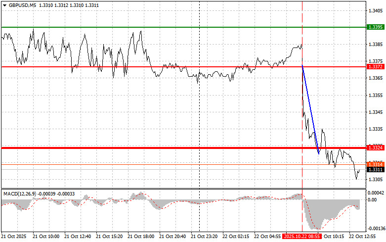اختبار السعر عند 1.3372 تزامن مع اللحظة التي بدأ فيها مؤشر MACD بالتحرك نحو الأسفل من الخط الصفري، مما أكد نقطة الدخول الصحيحة لبيع الجنيه. ونتيجة لذلك، انخفض الزوج نحو مستوى الهدف عند 1.3324.
