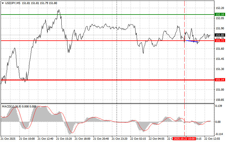 حدث اختبار السعر عند 151.72 في النصف الأول من اليوم عندما كان مؤشر MACD قد بدأ للتو في التحرك نحو الأسفل من خط الصفر، مما أكد نقطة الدخول الصحيحة لبيع الدولار — ومع ذلك، لم يتبع ذلك انخفاض كبير في الزوج.