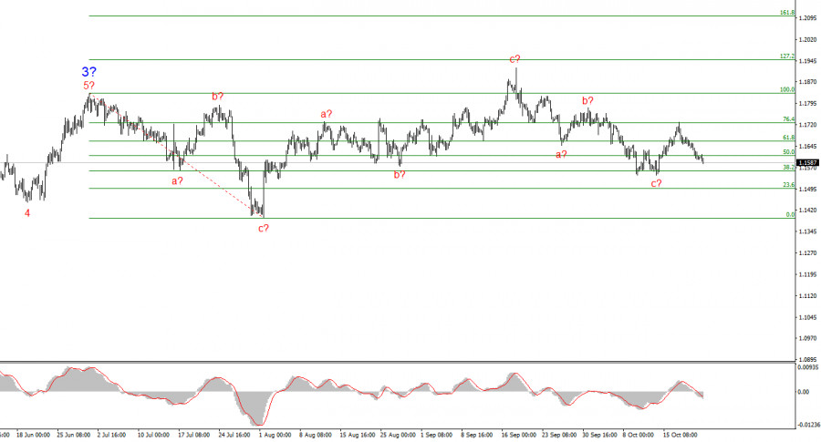 يستمر بناء الاتجاه الصاعد، بينما الخلفية الإخبارية تفشل في الغالب في دعم الدولار الأمريكي. تستمر الحرب التجارية التي بدأها دونالد ترامب. يستمر الصراع مع الاحتياطي الفيدرالي. تتزايد توقعات السوق "المتساهلة" بشأن سياسة الفيدرالي. لا يزال إغلاق الحكومة الأمريكية مستمراً. السوق لديه رأي منخفض إلى حد ما عن الأشهر التسعة الأولى لترامب في المنصب، على الرغم من أن نمو الناتج المحلي الإجمالي في الربع الثاني وصل إلى ما يقرب من 4%.