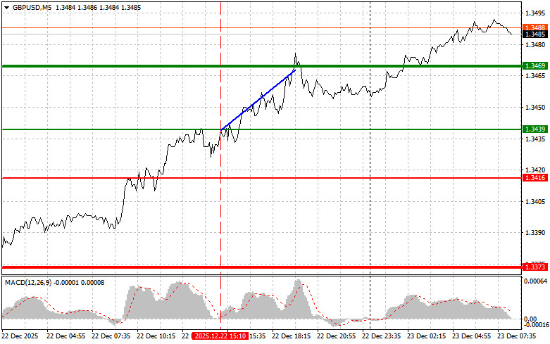 যখন MACD সূচকটি শূন্যের উপরের দিকে উঠতে শুরু করছিল তখন এই পেয়ারের মূল্য 1.3439-এর লেভেল টেস্ট করেছিল, যা পাউন্ড ক্রয় করার জন্য সঠিক এন্ট্রি পয়েন্ট হিসেবে নিশ্চিত হয়েছিল। এর ফলস্বরূপ, এই পেয়ারের মূল্য 1.3469-এর লক্ষ্যমাত্রার দিকে অগ্রসর হয়।