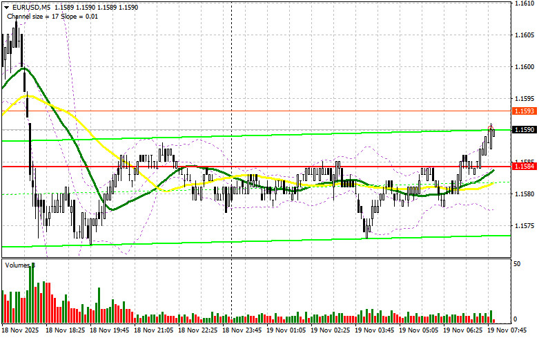 Вчера нямаше подходящи точки за влизане на пазара. Нека разгледаме 5-минутната графика и да анализираме какво се е случило. В сутрешната си прогноза подчертах нивото 1.1584 и планирах да вземам решения за влизане на базата на него. Случи се спад, но ситуацията не стигна до тест на 1.1584, така че останах без сделки през първата половина на деня. Същото се повтори и през втората половина на деня.