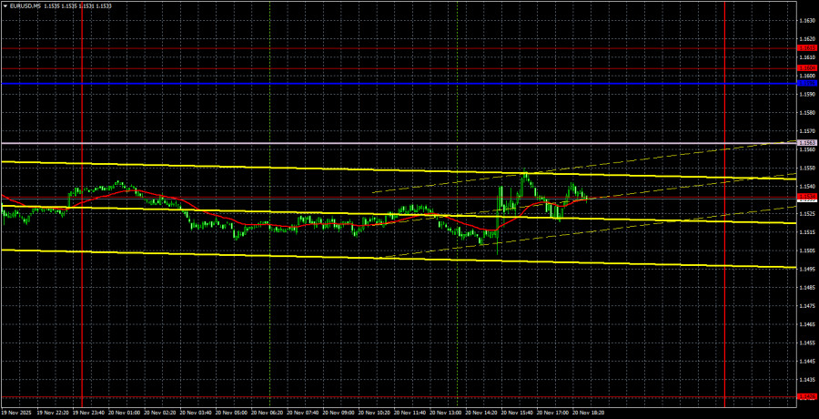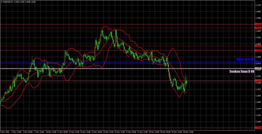 За 21 ноември, отбелязваме следните значителни нива за търговия: 1.1234, 1.1274, 1.1362, 1.1426, 1.1534, 1.1604-1.1615, 1.1657-1.1666, 1.1750-1.1760, 1.1846-1.1857, 1.1922, 1.1971-1.1988, както и линиите Senkou Span B (1.1563) и Kijun-sen (1.1578). Линиите на индикатора Ichimoku могат да се променят през деня, което трябва да се вземе предвид при определяне на търговски сигнали. Не забравяйте да поставите стоп-лос поръчка на равнище без загуби, ако цената се движи във вярната посока с 15 пипса. Това ще ви предпази от потенциални загуби, ако сигналът е грешен.