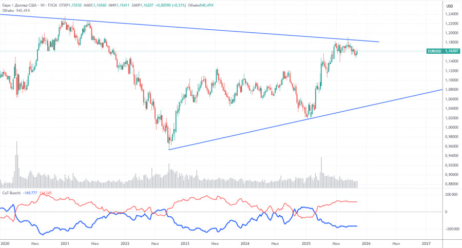 Все още не виждаме основополагащи фактори, които биха укрепили еврото, докато има достатъчно фактори, които биха отслабили долара. Глобалната низходяща тенденция остава непокътната, но последните 17 години движения на цените сега са в голяма степен нерелевантни. След като Тръмп приключи своите търговски войни, доларът може да започне да поскъпва, но кога ще се случи това, никой не може да каже.