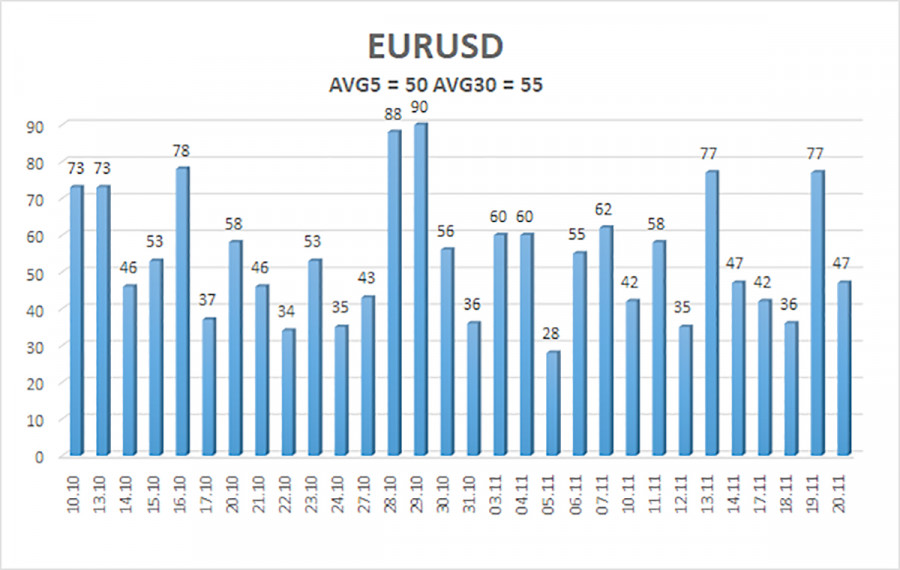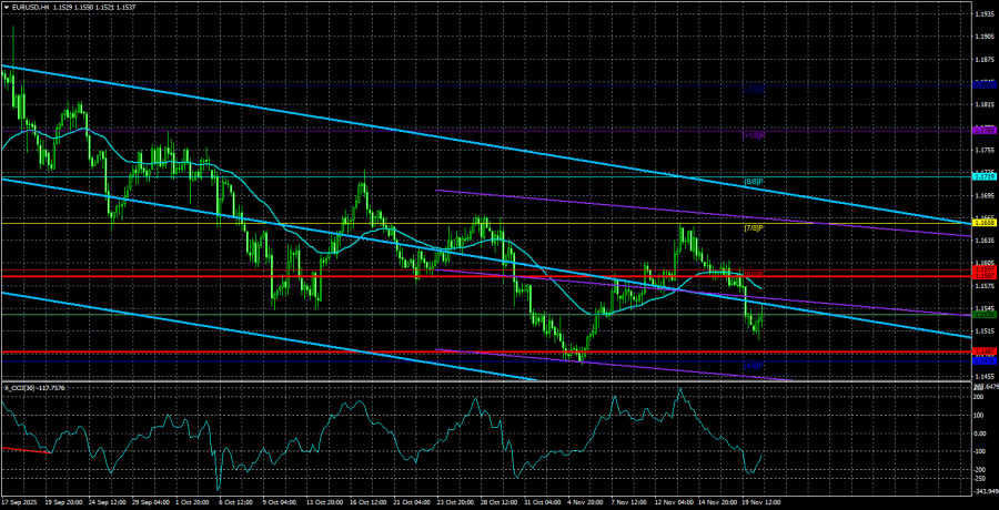 Средната волатилност за двойката EUR/USD през последните пет търговски дни към 21 ноември е 50 пипси и се характеризира като "ниска". Очакваме двойката да търгува между 1.1487 и 1.1587 в петък. Горният канал на линейната регресия е насочен надолу, което сигнализира за низходящ тренд, но всъщност на дневния таймфрейм продължава плосък ход. Индикаторът CCI два пъти влезе в зоната на свръхпродажби през октомври, което може да предизвика нов възходящ тренд през 2025 година. Може скоро индикаторът да влезе за трети път в зоната на свръхпродажби.
