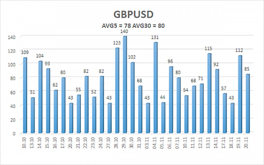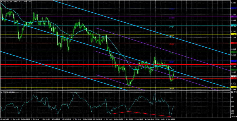Средната волатилност на двойката GBP/USD през последните пет търговски дни е 78 пипса и продължава да намалява. Ето защо, на петък, 21 ноември, очакваме движение в рамките на диапазон, ограничен от нивата 1.3003 и 1.3159. Горният канал на линейната регресия е насочен надолу, но това се дължи само на техническа корекция на по-високите времеви рамки. Индикаторът CCI е влязъл в зоната на препродадени стойности за шести път през последните месеци, формирайки ново възходящо отклонение.