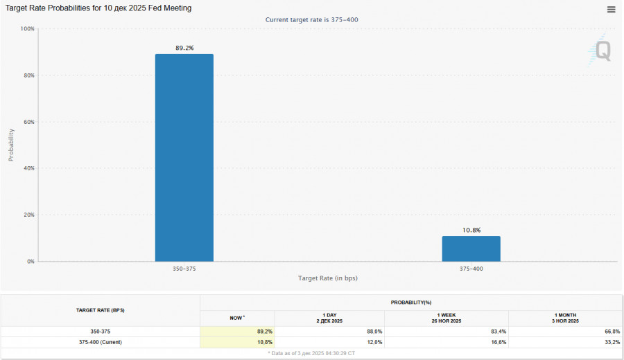 Повечето икономисти и основни инвестиционни банки прогнозират допълнително намаляване на лихвените проценти на срещата на Фед през декември. Те вярват, че намаление от 25 базисни пункта ще понижи разходите по заеми и ще подкрепи икономиката. Въпреки това, ако следващите статистически данни от САЩ са по-силни от очакваното, регулаторът може да преразгледа решението си. Не забравяйте, че срещата на централната банка на САЩ ще се проведе следващата седмица. Интересно е, че ръководителят на агенцията, Джером Пауъл, докато говореше на дискусия за Джордж Шулц (американски държавник, който заемаше различни позиции в правителството и оказа влияние върху политиката на САЩ в различни области, включително икономиката), в Станфордския университет, отбеляза че Фед е готов за облекчаване на политиката, но всичко ще зависи от постъпващите статистически данни, както и от съществуващите инфлационни рискове.