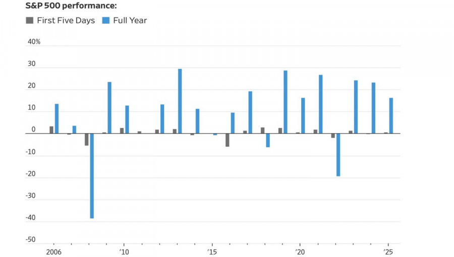 Като започнете новата година, така често се случва. През шест от последните седем години, S&P 500 се движи в същата посока през останалата част от годината, в която се е движил и през първите пет търговски дни на януари. От 1950 година насам, движението на индекса през тези периоди съвпада в 68% от случаите. Затова не е изненадващо, че силният старт на американските акции в началото на 2026 година е подхранил оптимизма.