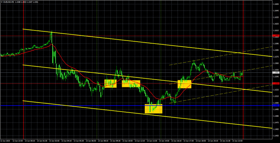 Měnový pár EUR/USD si v hodinovém grafu udržuje lokální rostoucí trend, a to i přesto, že prorazil a překonal všechny možné rostoucí trendové linie. Stejně jako během posledních čtyř měsíců, trh reaguje výhradně na události související s Trumpem, jeho rozhodnutími a obchodní válkou. K tomu nyní přibyla "úžasná a pozitivní" válka na Blízkém východě. Pozitivní zprávy nejsou žádné, pouze negativní — a těch je víc než dost. Proto dolar nadále výrazně oslabuje.