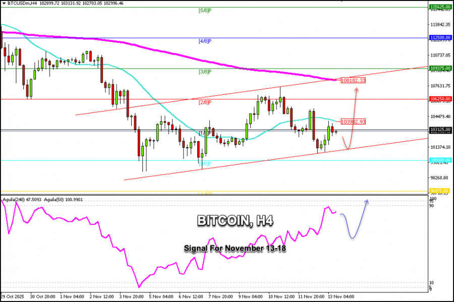 Bitcoin handelt um 103.125, nahe dem 1/8-Murray-Level und unter dem 21er SMA, innerhalb des aufsteigenden Trendkanals, der am 3. November gebildet wurde.