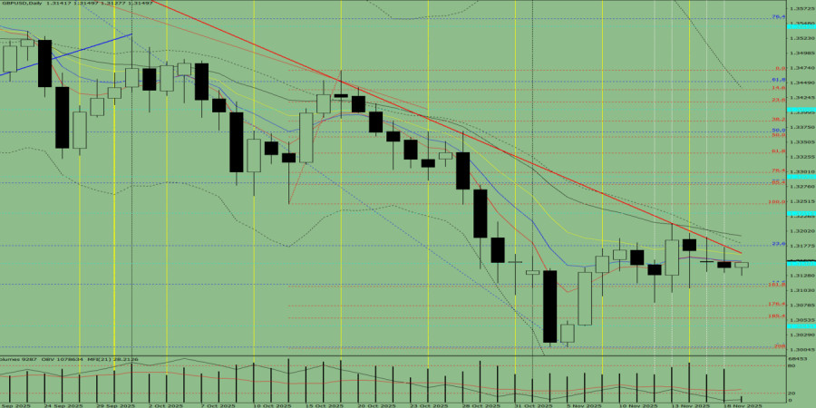 Scénario alternatif : Mercredi, le marché pourrait commencer à évoluer à la hausse depuis le niveau de 1.3141 (la clôture des chandeliers quotidiens d'hier), en visant 1.3232 — un niveau de résistance historique (ligne pointillée bleue). Lors du test de cette ligne, le prix pourrait reculer vers 1.3194 — l'EMA de 21 périodes (fine ligne noire).