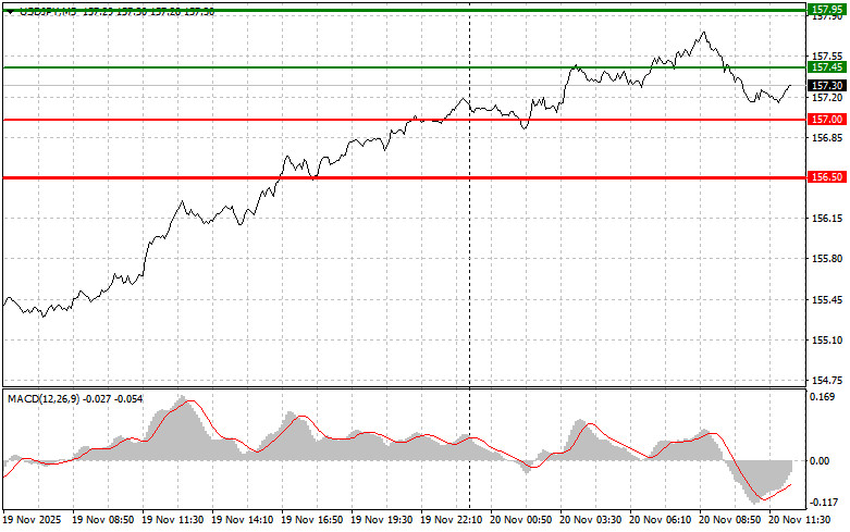 Scénario n° 1 : Je prévois d'acheter USD/JPY aujourd'hui lors de l'atteinte du point d'entrée autour de 157,45 (ligne verte sur le graphique), avec pour objectif une hausse jusqu'à 157,95 (ligne verte plus épaisse sur le graphique). Autour de 157,95, je sortirai des positions d'achat et ouvrirai des positions de vente en sens inverse (en espérant un retournement de 30 à 35 points à partir de ce niveau). Une croissance de la paire est attendue dans le cadre du marché haussier actuel. Important ! Avant d'acheter, assurez-vous que l'indicateur MACD est au-dessus de la ligne zéro et commence à s'en éloigner.