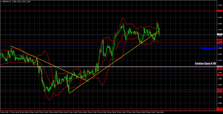 Pour le 2 décembre, nous soulignons les niveaux importants suivants : 1.2863, 1.2981-1.2987, 1.3042-1.3050, 1.3096-1.3115, 1.3201-1.3212, 1.3307, 1.3369-1.3377, 1.3420, 1.3533-1.3548, 1.3584. Les lignes Senkou Span B (1.3124) et Kijun-sen (1.3193) peuvent également fournir des signaux. Il est recommandé de placer le Stop Loss au point mort une fois que le prix évolue de 20 pips dans la bonne direction. Les lignes de l'indicateur Ichimoku peuvent changer au cours de la journée, ce qui devrait être pris en compte lors de la détermination des signaux de trading.