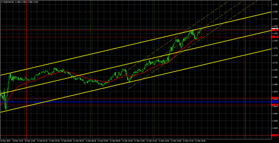 La paire de devises EUR/USD s'est déplacée dans une seule direction – à la hausse – pendant mercredi et jeudi. La volatilité était assez élevée cette fois-ci, contrairement à ce à quoi nous avons été habitués ces derniers mois. En principe, il est clair pour tous les traders d'où vient ce mouvement. Mercredi soir, la Réserve fédérale a tenu une réunion, annonçant sa décision de baisser le taux d'intérêt clé (ce qui était assez attendu) et évoquant des perspectives "neutres" pour la politique monétaire pour l'année à venir. Nous ne considérons pas que les résultats de la réunion de la Fed soient définitivement "accommodants", car la décision de réduire le taux d'intérêt clé en décembre était connue quelques semaines plus tôt. Cependant, nous avons toujours affirmé que quelle que soit la décision de la Fed, nous n'attendons qu'une baisse du dollar. Au minimum, dans la fourchette du canal latéral visant 1,1800. Au maximum, nous anticipons une reprise de la tendance haussière de 2025. Pour l'instant, tout va dans ce sens, car le contexte fondamental mondial reste désastreux pour le dollar, et une tendance à plat finira par prendre fin.
