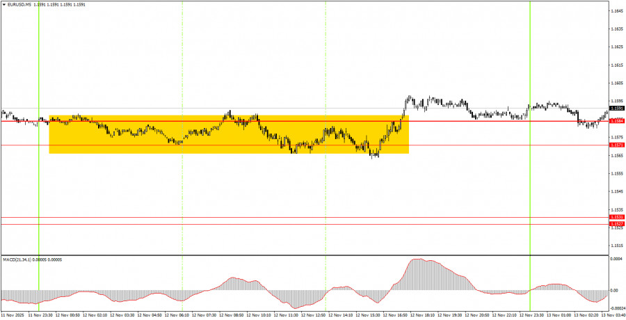 Pada kerangka waktu 5 menit, pasangan ini trading mendatar hampir sepanjang hari dalam area 1.1571-1.1584. Dengan demikian, kita mengamati pergerakan datar total bahkan pada kerangka waktu 5 menit. Pasangan ini mencoba untuk keluar dari rentang ini beberapa kali, tetapi harus dipahami bahwa semua pergerakan kemarin hanyalah kebisingan pasar. Selama sesi trading Amerika, harga berhasil menetap di atas area tersebut, memungkinkan trader pemula untuk membuka posisi beli yang masih dapat dipertahankan, karena harga tetap relatif stagnan. Namun, ada bias naik yang lemah.