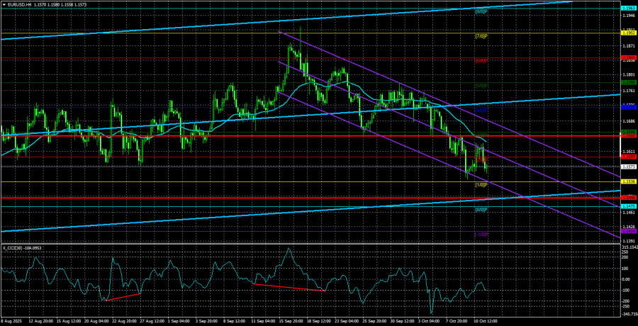 The average volatility for EUR/USD over the last five trading days, as of October 14, stands at 77 pips, which is classified as "average." We expect the pair to trade between 1.1496 and 1.1650 on Tuesday. The higher linear regression channel is pointing upward, which still indicates the presence of a bullish trend. The CCI indicator has just entered oversold territory, potentially signaling a new wave of upward momentum.
