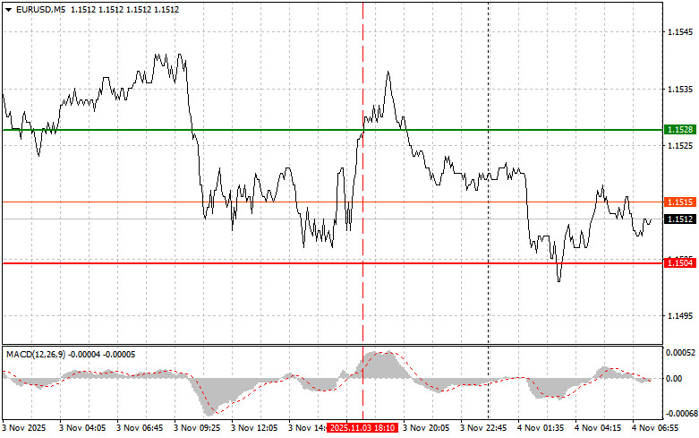 The test of the price at 1.1528 coincided with the moment when the MACD indicator had risen significantly above the zero mark, limiting the upside potential of the pair. For this reason, I did not buy euros.