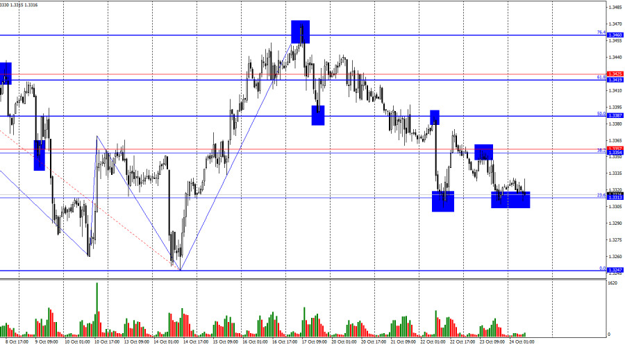 Pada carta setiap jam, pasangan GBP/USD pada hari Khamis telah melantun balik dari paras rintangan 1.3354–1.3357 dan susut ke arah paras pembetulan Fibonacci 23.6% pada 1.3313. Lantunan dari tahap 1.3313 hari ini mungkin memberi kelebihan kepada pound dan mencadangkan sedikit pertumbuhan ke arah 1.3354 dan 1.3387. Pengukuhan kadar pasangan di bawah 1.3313 akan meningkatkan kebarangkalian penurunan berterusan ke arah paras 0.0% Fibonacci pada 1.3247, yang berkemungkinan memberi isyarat penamatan aliran kenaikan.