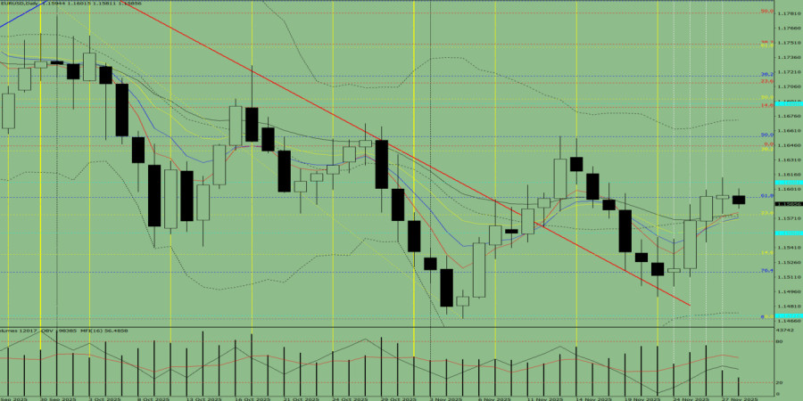 Senario alternatif: Hari ini, dari tahap 1.1595 (penutupan lilin harian semalam), harga mungkin mula bergerak ke bawah dengan sasaran 1.1575 — tahap anjakan semula 23.6% (garisan putus kuning). Apabila menguji tahap ini, pergerakan pembetulan ke atas adalah mungkin dengan sasaran 1.1592 — tahap anjakan semula 61.8% (garisan putus biru).