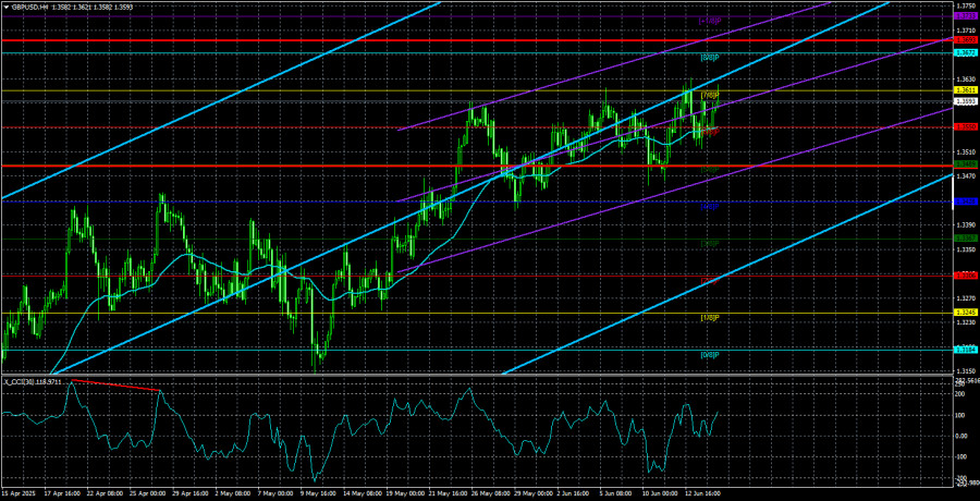 17 جون تک، پچھلے پانچ تجارتی دنوں میں برطانوی پاؤنڈ/امریکی ڈالر کی اوسط اتار چڑھاؤ 103 پپس ہے، جسے اس جوڑے کے لیے "اعتدال پسند" سمجھا جاتا ہے۔ لہذا، ہم توقع کرتے ہیں کہ جوڑی منگل کو 1.3487 اور 1.3693 کے درمیان تجارت کرے گی۔ طویل مدتی ریگریشن چینل اوپر کی طرف اشارہ کرتا ہے، جو واضح اوپر کی طرف رجحان کی نشاندہی کرتا ہے۔ CCI اشارے حال ہی میں انتہائی زون میں داخل نہیں ہوا ہے۔