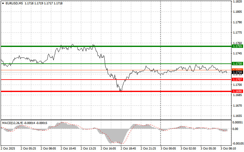 Test 1,1746 zbiegł się ze spadkiem wskaźnika MACD poniżej poziomu zera, co wywołało sygnał sprzedaży euro. W rezultacie para spadła w kierunku docelowego poziomu 1,1712.