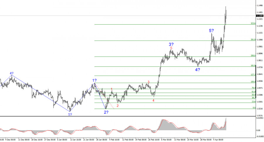 A estrutura de ondas no gráfico de 4 horas do EUR/USD assumiu uma configuração de alta. Não há dúvidas de que essa transformação foi causada exclusivamente pela nova política comercial dos Estados Unidos. Até 28 de fevereiro — quando começou a forte queda do dólar americano — a estrutura de ondas apontava para uma tendência de baixa bem definida, com a onda corretiva 2 ainda em formação. No entanto, os anúncios semanais de Donald Trump sobre novas tarifas surtiram efeito. A demanda pela moeda americana caiu rapidamente, e agora todo o segmento de tendência iniciado em 13 de janeiro formou um padrão impulsivo de cinco ondas.