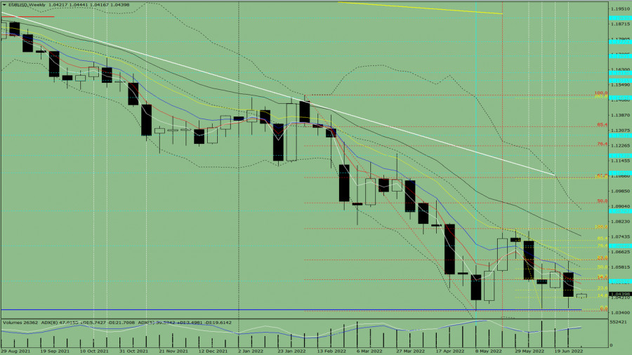 На этой неделе рынок от уровня 1.0426 (закрытие последней недельной свечи) попробует начать движение вверх с цель тестирования откатного уровня 14.6% - 1.0514 (красная пунктирная линия). От этого уровня цена может продолжить движение вверх со следующей целью 1.0619 – откатный уровень 23.6% (красная пунктирная линия).