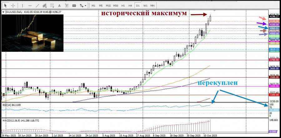А с технической точки зрения золото продемонстрировало хорошую устойчивость ниже круглого уровня $4100. Более того, рост, наблюдаемый в течение последних трёх недель, движется вдоль восходящей линии поддержки тренда, указывая на то, что путь наименьшего сопротивления для золота восходящий. Но экстремальная перекупленность RSI - дневного индекса относительной силы - требует осторожности для открытия новых позиций на покупку.