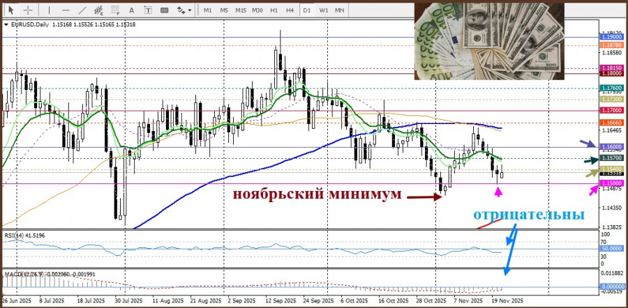 А если ценам не удастся удержать психологический уровень 1,1500, то цены ускорят падение к ноябрьскому минимуму и ниже.