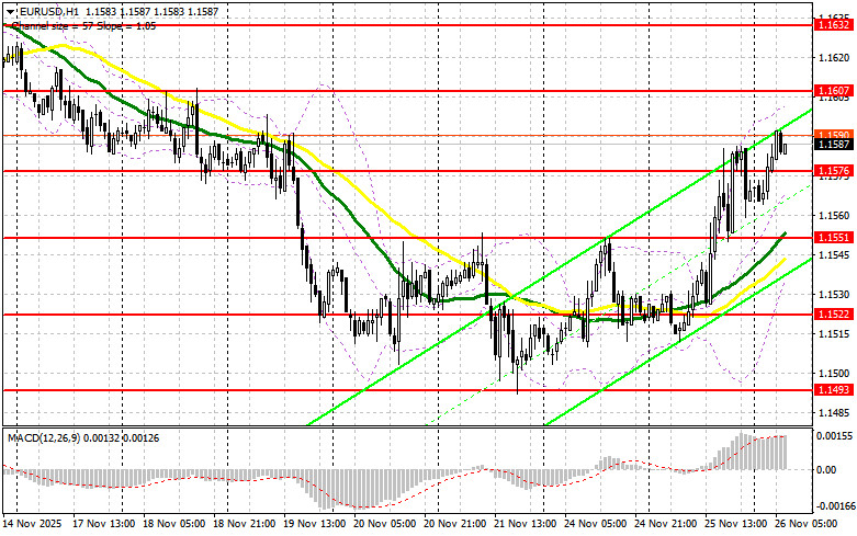 Резкое падение индикатора потребительской уверенности в США и объема розничных продаж стало проблемой для американского доллара. Плохие данные еще раз напомнили трейдерам о том, что Федеральная резервная система США может пойти на еще одно снижение процентных ставок в ходе декабрьского заседания. Сегодня в первой половине дня ожидается лишь отчет Европейского центрального банка по финансовой стабильности, а также выступление президента ЕЦБ Кристин Лагард. Если отчет ЕЦБ не разочарует, скорей всего евро продолжит рост против доллара. Но действовать, конечно, предпочтительней на снижении. Первого проявления покупателей ожидаю в районе поддержки 1.1576, образованной по итогам вчерашнего дня. Формирование там ложного пробоя даст точку входа в длинные позиции с целью восстановления пары к сопротивлению 1.1607. Прорыв и обратный тест этого диапазона станут подтверждением правильных действий на покупку евро уже в расчете на более крупный рывок пары к 1.1632. Самой дальней целью выступит максимум 1.1644, где буду фиксировать прибыль. Тест этого уровня вернет бычий рынок по евро. При варианте снижения EUR/USD, и отсутствия активности в районе 1.1576, давление на пару только увеличится. Продавцы наверняка сумеют дотянуться до следующего интересного уровня 1.1551. Лишь формирование там ложного пробоя будет подходящим условием на покупку евро. Открывать длинные позиции сразу на отскок будут от 1.1522 с целью восходящей коррекции в 30-35 пунктов внутри дня.