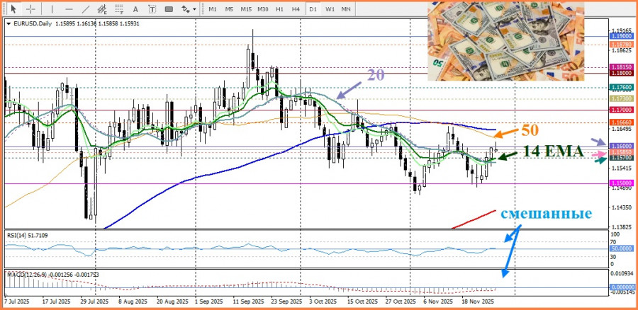 Тем временем большинство экспертов прогнозирует, что ЕЦБ оставит депозитную ставку без изменений в этом году и не внесет коррективов до конца следующего. Это, в свою очередь, играет на руку быкам по евро, предполагая, что наиболее вероятный сценарий для пары EUR/USD — восходящий. Тем не менее прежде чем рассчитывать на продолжение роста пары, было бы целесообразным дождаться устойчивого пробоя выше 50-дневной простой скользящей средней (SMA), которая сейчас находится около 1,1622. К тому же скромные объемы торгов перед Днем благодарения в США требуют от трейдеров повышенной бдительности, настроенных на рост пары.