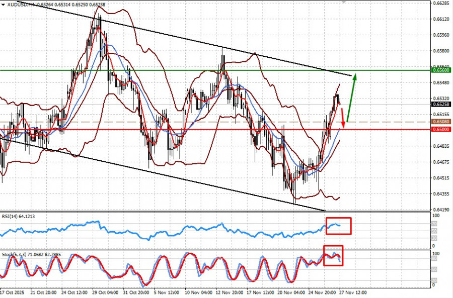 Остается в краткосрочном нисходящем тренде, у его верхней границы. Пара может сегодня завтра скорректироваться вниз к 0.6500, после чего получить поддержку и развернуться вверх, и подрасти к 0.6560 на волне ожидания снижения ставок ФРС в декабре. Уровнем для ее покупки может служить отметка 0.6508.