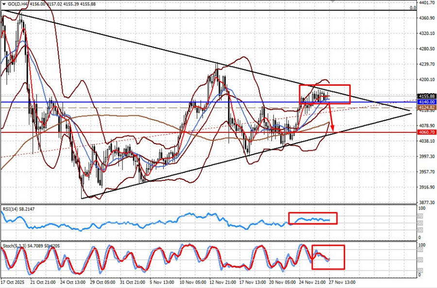Цена на золото консолидируется чуть выше уровня 4140.00. Снижение ниже этой отметки может привести к ее падению к 4060.70. Уровнем для продажи золото может служить отметка 4124.82.